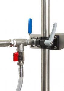 An important feature is: our own design, Quick-Action-Clamp. This clamp is fixed on the frame and used to hold the cover. This enables a quick and easy exchange of the vessel without the need to remove the upper section (motor/ dynamic seal/ cover). Exchanging the vessel now is a single-person-operation! Quick and easy!
